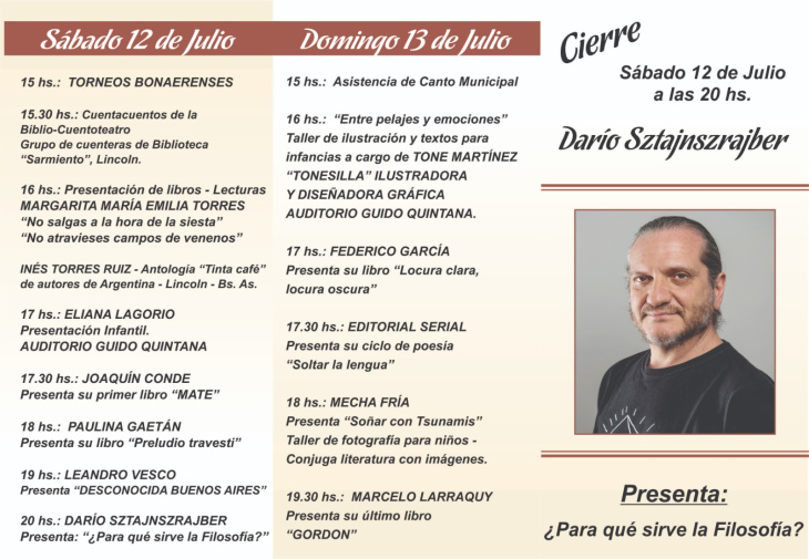 El sábado a las 20 horas la feria contará con la presencia del ensayista y escritor Darío Sztajnszrajber, quien presentará el espectáculo “Qué es la filosofía”.