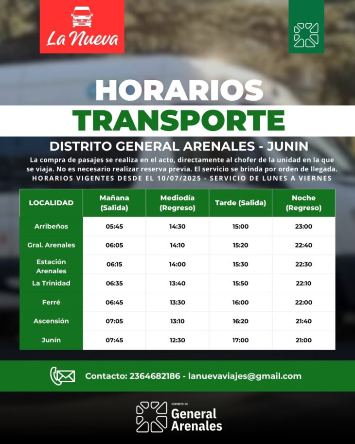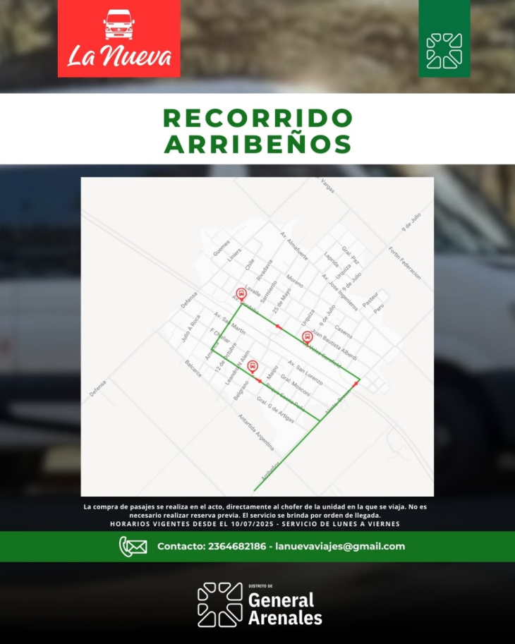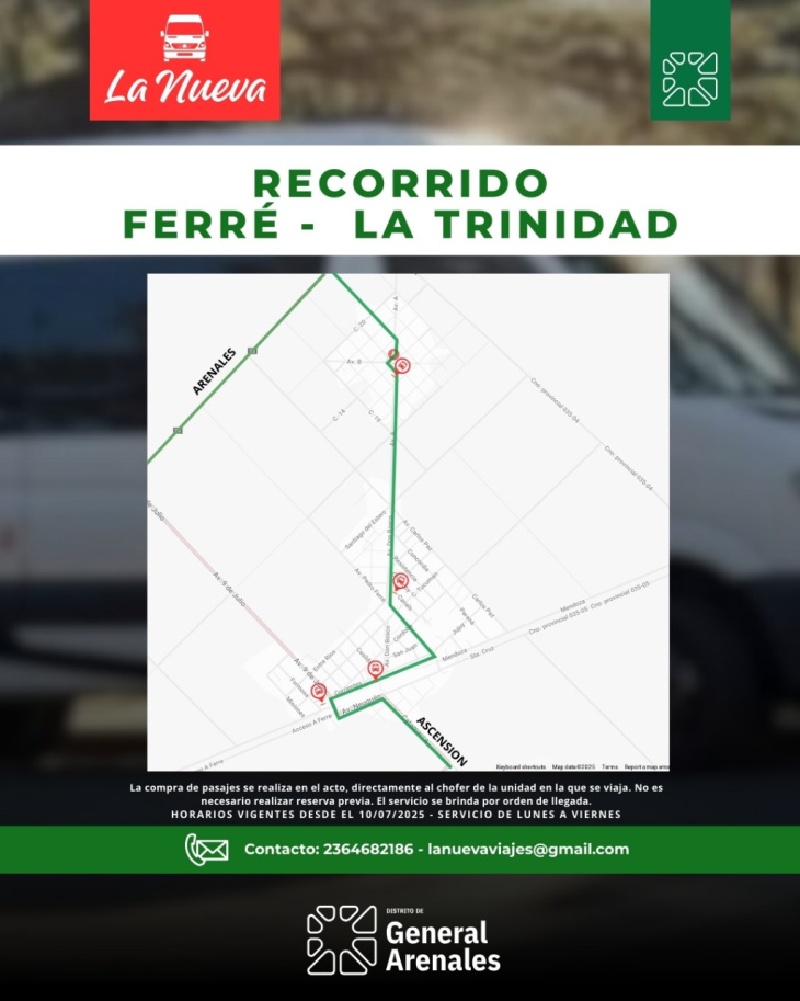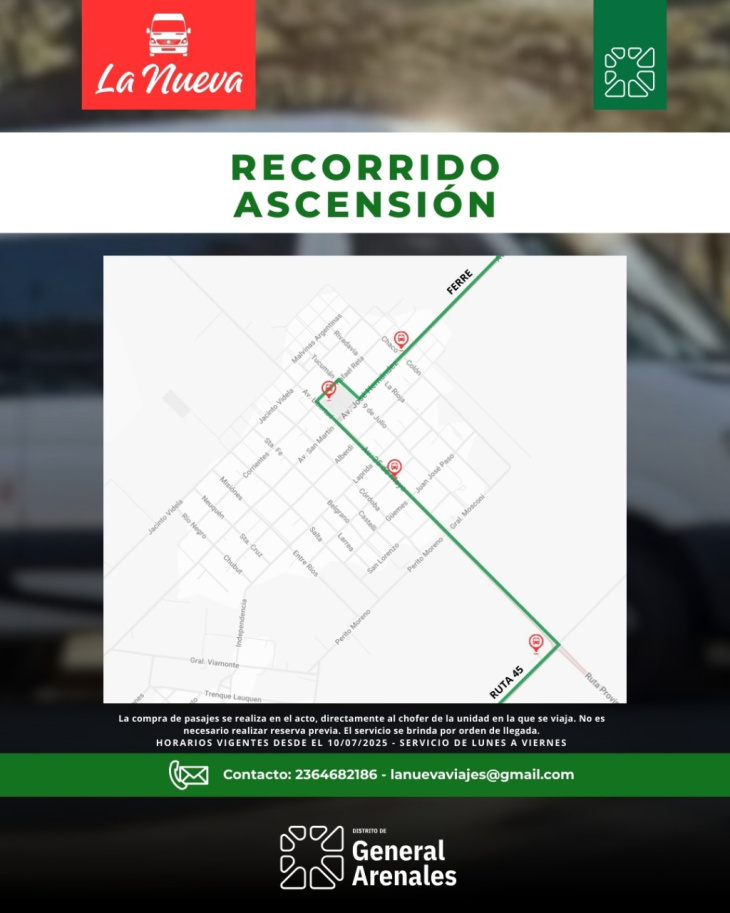 Este servicio recorrerá las localidades de General Arenales, Arribeños, Ascensión, La Angelita, Ferré, La Trinidad, Estación Arenales y la zona del Matadero Municipal, asegurando que cada punto del distrito tenga acceso a una movilidad segura y accesible.