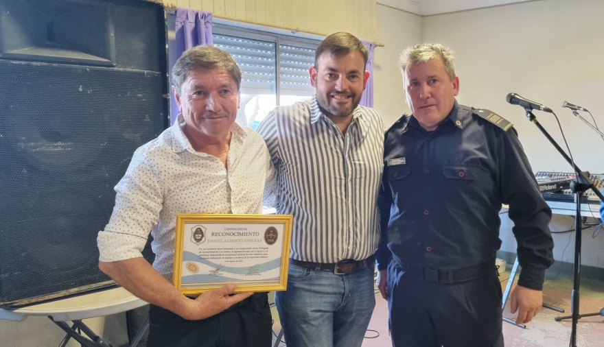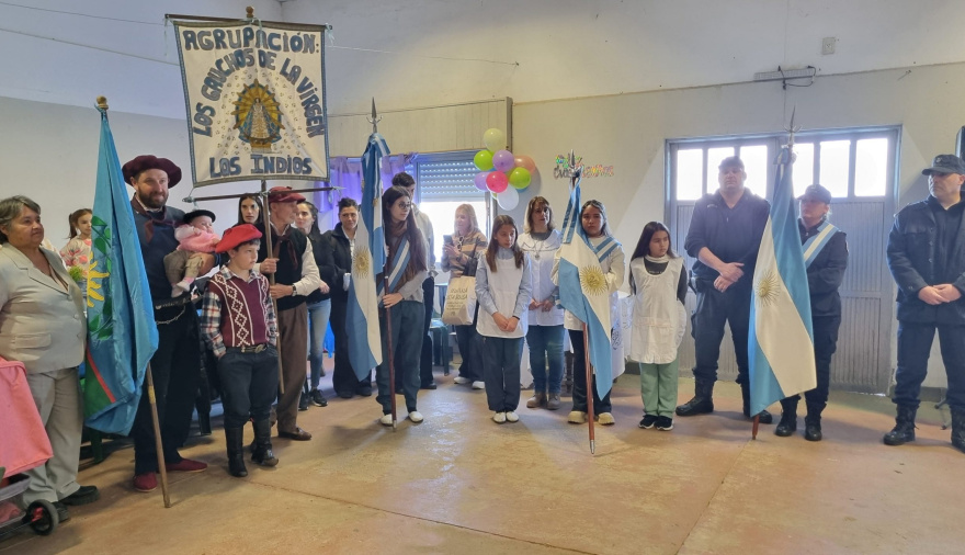 El acto contó además con la presencia de banderas ceremoniales de la escuela local, del puesto policial y del Centro Tradicionalista de Los Indios, reforzando el espíritu identitario de la celebración.
