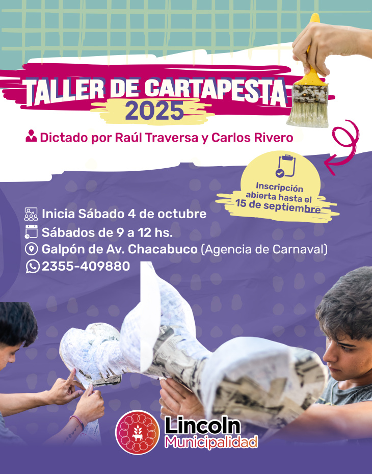 La Municipalidad de Lincoln informó que se encuentra abierta la inscripción para el taller gratuito en la técnica de cartapesta, a cargo de los artesanos Carlos Rivero y Raúl Traversa.