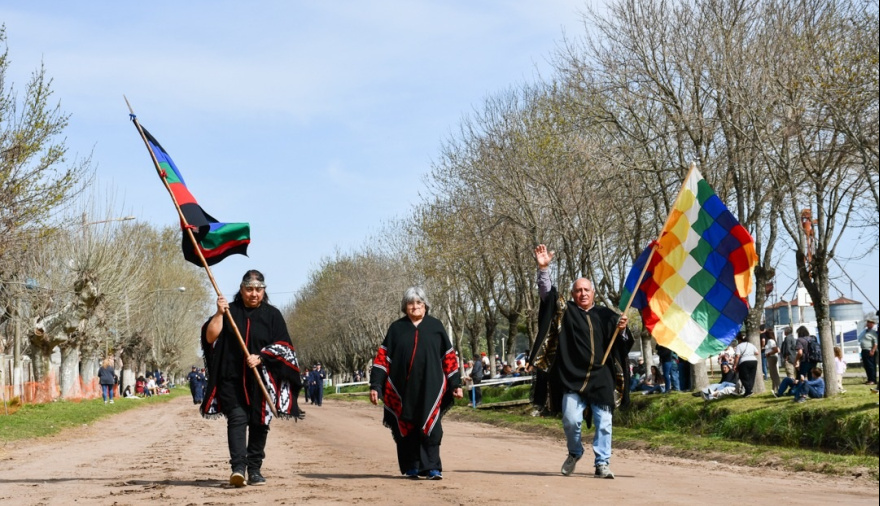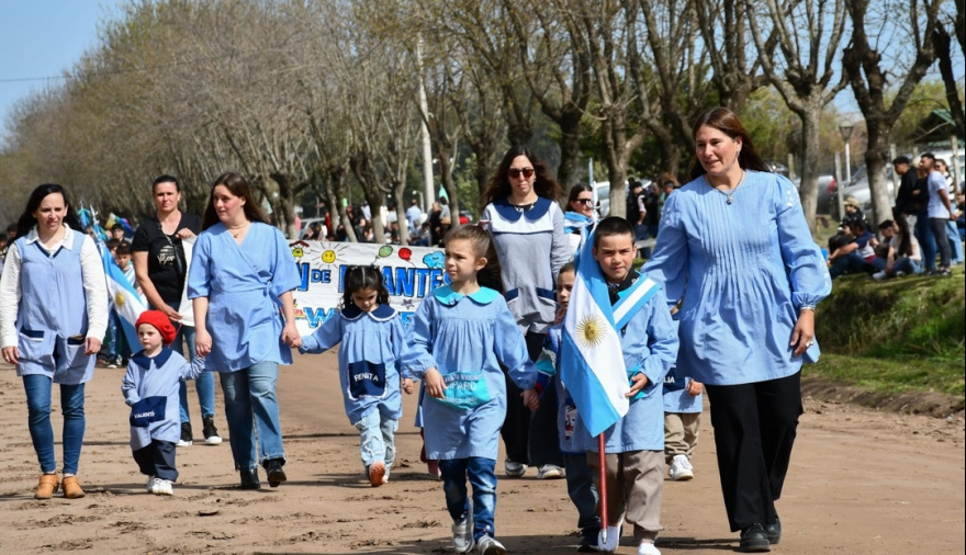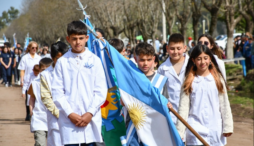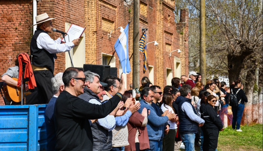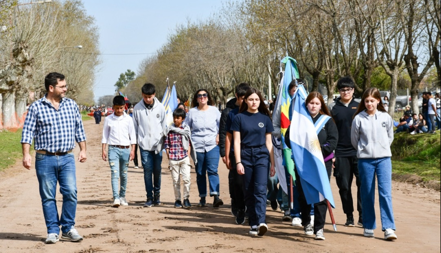 La celebración comenzó con el Desfile Institucional y Tradicionalista, que inició con la simbólica autorización del intendente Sergio Barenghi, acompañado por el delegado Héctor Pelefigue y otras autoridades del Ejecutivo.