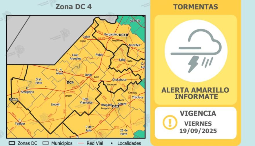 El Servicio Meteorológico Nacional (SMN) emitió una alerta amarilla por tormentas que afectará a Junín y distintas zonas del noroeste bonaerense desde la noche de este jueves hasta la mañana del viernes.