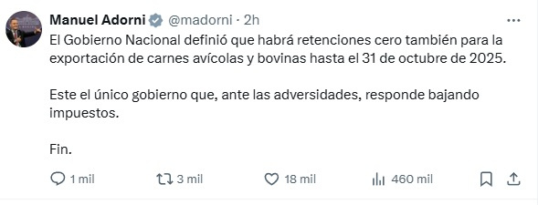 Así lo anunció el vocero presidencial, Manuel Adorni, en sus redes sociales.