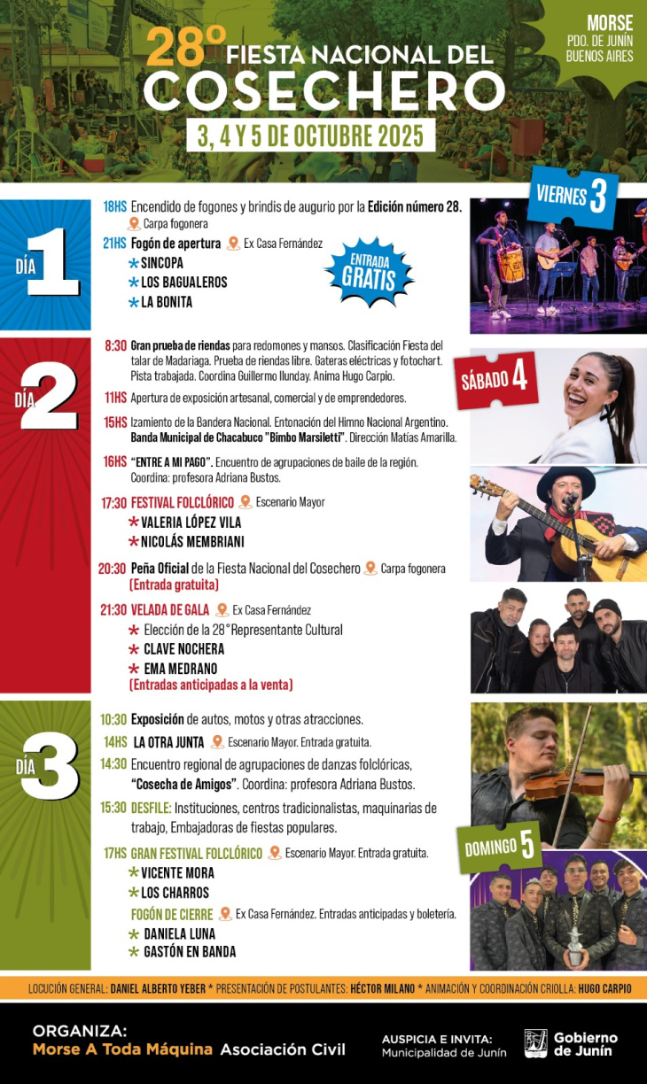 La Localidad de Morse ya se prepara para vivir la XXVIII Fiesta Nacional del Cosechero. Esta nueva edición se llevará a cabo los días 3, 4 y 5 de octubre con la actuación de variados números artísticos, actividades tradicionales, además del clásico desfile por las calles del pueblo.
