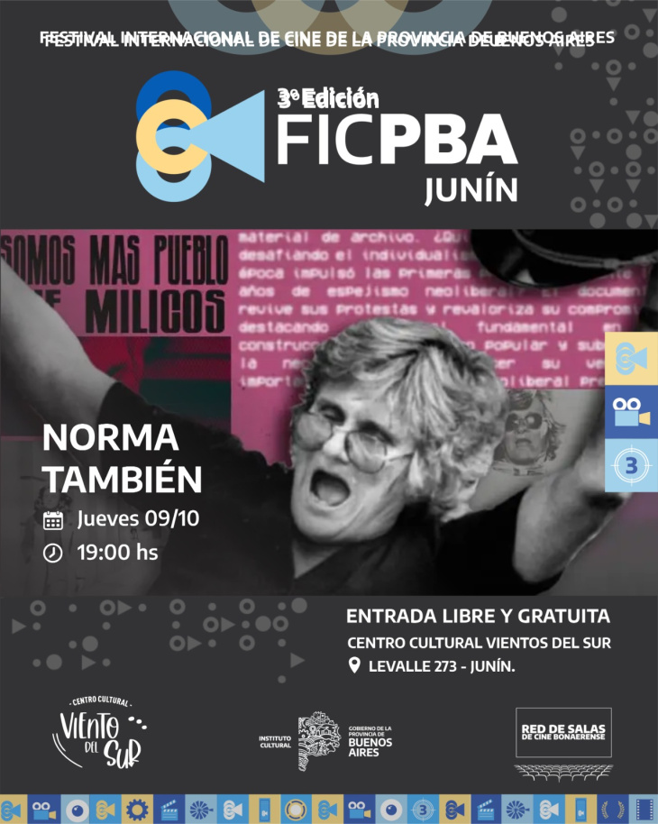 El Centro Cultural “Viento del Sur” también es sede de la tercera edición del Festival Internacional de Cine de la Provincia de Buenos Aires (FICPBA) y en este marco el jueves 9 de octubre se proyectará, a las 19 horas y con entrada libre y gratuita, el documental “Norma También”.