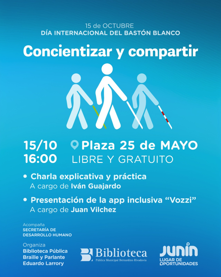 Desde la biblioteca braille parlante "Eduardo Larrory" y en conjunto con Cultura y la Dirección para Personas con Discapacidad del Gobierno de Junín, se invita a toda la comunidad a formar parte de una actividad especial a modo de conmemoración por el Día Internacional del Bastón Blanco que se llevará a cabo el miércoles 15, a partir de las 16 hs en la plaza 25 de Mayo.