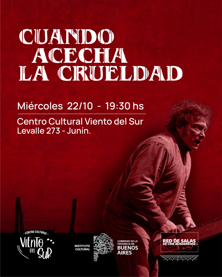 “Cuando acecha la crueldad” se podrá presenciar en “Viento del Sur”, ya que el centro cultural de Junín fue incorporado recientemente a la Red de Salas de Cine Bonaerense, proyecto que promueve el Instituto Cultural del Gobierno de la Provincia de Buenos Aires.