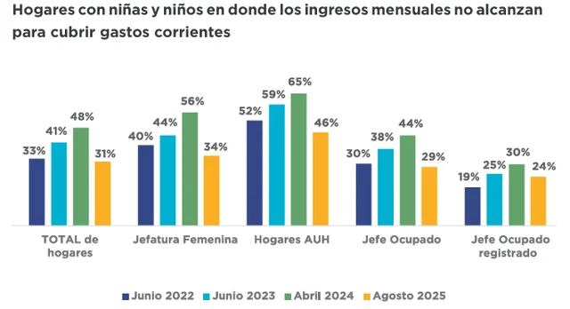 El número alcanzó al 30% de los hogares versus un 52% en 2024. Y dependiendo el sector social, el indicador varía en aumento o descenso: 45% en hogares con AUH (Asignación Univrsal por Hijo) y 37% en los hogares monoparentales con jefatura femenina.