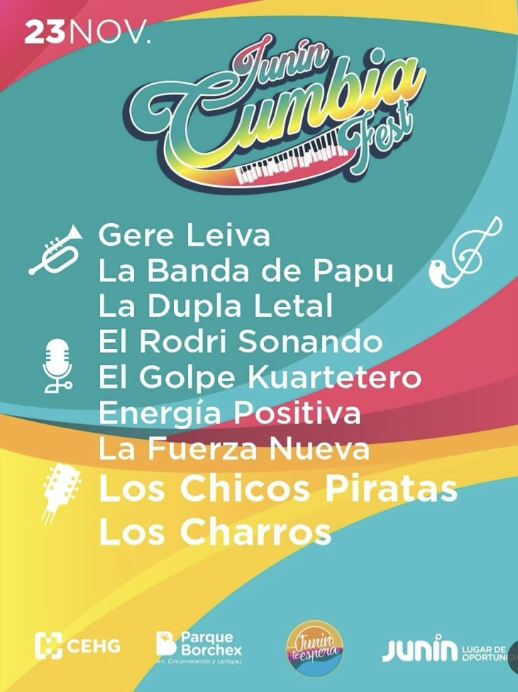 Este domingo 23 de noviembre, el Parque Borchex será nuevamente sede del Cumbia Fest, un evento organizado por el Gobierno de Junín en conjunto con la Cámara Empresaria Hotelera Gastronómica (CEHG) y artistas locales. La propuesta incluye shows en vivo, un amplio patio gastronómico, paseo de emprendedores y actividades para toda la familia.