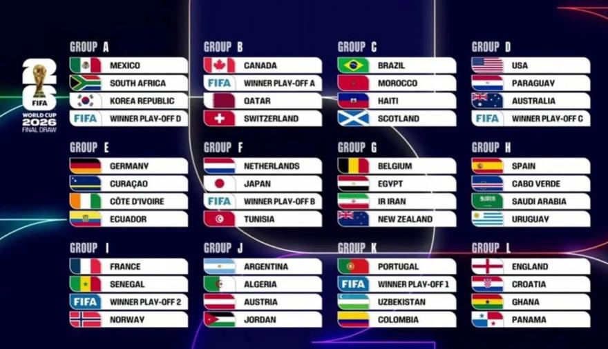 Portugal aparece en el Grupo K y espera por Nueva Caledonia, Jamaica o República Democrática del Congo; además tendrá a Uzbekistán y Colombia. Inglaterra encabeza el Grupo L junto a Ghana, Croacia y Panamá.