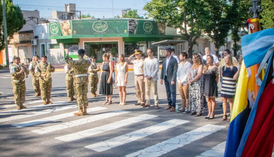Como es tradición en este tipo de celebraciones, se entonaron las estrofas del Himno Nacional Argentino, interpretado por la Banda Militar Curupaytí del Grupo de Artillería 10, y se realizó la colocación de ofrendas florales en homenaje al Comandante Escribano.