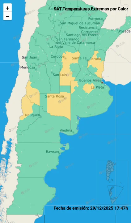 Según supo la Agencia Noticias Argentinas, se mantiene el alerta amarillo en zonas de Buenos Aires, Entre Ríos, La Pampa, Córdoba, Mendoza y Neuquén.