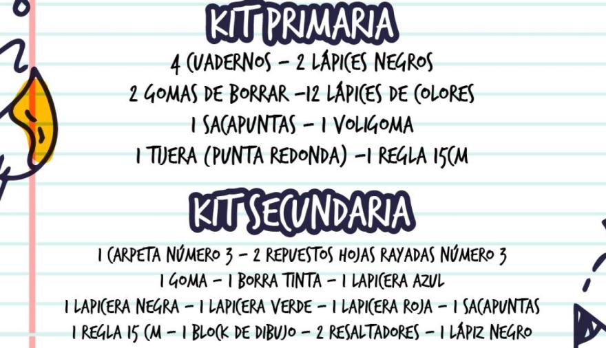 Los kits incluyen los elementos esenciales requeridos para cada nivel educativo y pueden adquirirse en librerías de distintas localidades del distrito, entre ellas: Bellón, Pachi, Manolito, Arco Iris, Manicomio, Condo, Olvidate, Sarmiento, Lo de Tasso y Elimar.