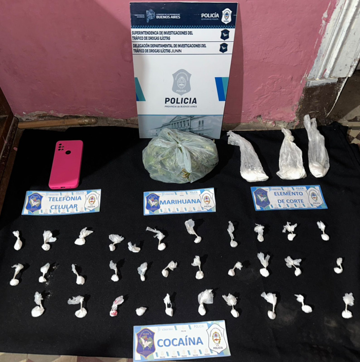 Desde la Departamental de Investigaciones del Trafico de Drogas Ilícitas Junín explicaron que “extendiendo el Juzgado Federal 3 órdenes de allanamientos, en el barrio San Francisco, para el día viernes 13 del corriente mes y año, las que fueron ejecutadas en horas de la tarde-noche; obteniendo como resultado el secuestro de bolsas y envoltorios de sustancia Marihuana de diferentes tamaños y guarismos, también más de 50 envoltorios de sustancia cocaína de máxima pureza, balanza de precisión, dinero en efectivo, un revólver calibre 22 con 4 cartuchos intactos en su almacén cargador, recortes de nylon, telefonía celular y demás elementos de interés para la prosecución de la causa”.
