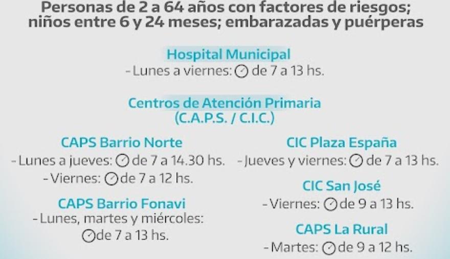 La aplicación de la vacuna es gratuita, no requiere orden médica y puede aplicarse junto a otras vacunas. La misma se realiza en el Vacunatorio del Hospital Municipal, de 7 a 13 horas, de lunes a viernes. Y en los CAPS y centros de Salud Barriales y Unidades Sanitarias de las respectivas localidades de acuerdo a su cronograma.