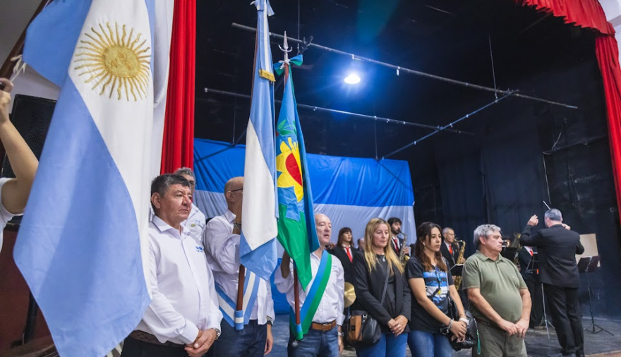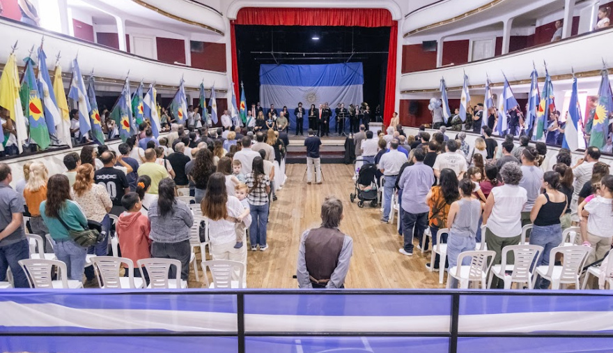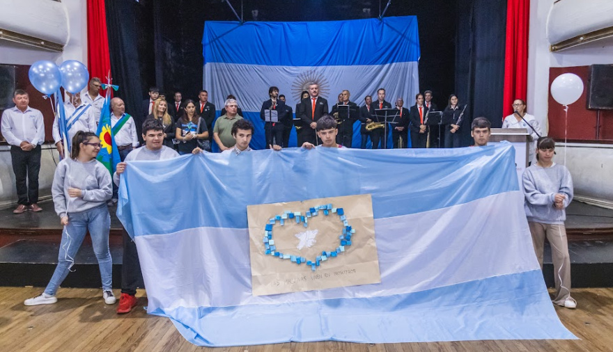 El acto contó con una destacada participación de la comunidad educativa, con el teatro colmado de abanderados, y tuvo como protagonistas a los Veteranos de Guerra de Malvinas del distrito, quienes portaron la bandera central: Carlos Cocco, Jorge Crespo, Daniel Zurita, Héctor Aníbal Páez y Oscar Dabove.