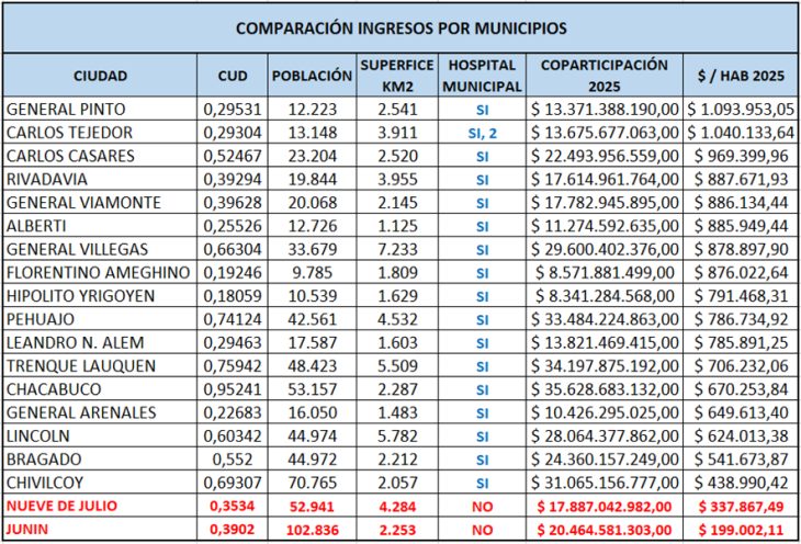 De acuerdo a los datos del año 2.025, Junín recibió $ 199.002,11 por habitante en el año. Mientras que otro municipios recibieron más de $ 1.000.000. Si, así es. Municipios de similar tamaño, con un tercio de habitantes, recibieron el doble, triple y hasta más del cuádruple que Junín.