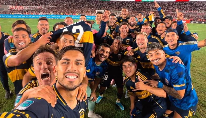 Los jugadores de Boca se reunieron en la mitad de la cancha del estadio Monumental para celebrar, con una serie de selfies, haber conseguido su segundo triunfo consecutivo en el Superclásico del fútbol argentino.